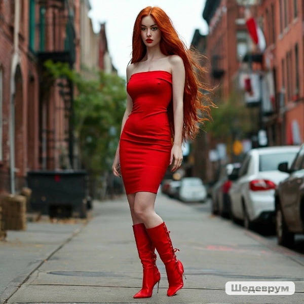 Пример одежды | В обтягивающем алом платье с открытыми плечами и узкой юбке до колена. В телесного сапожках на шпильках. |
